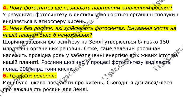 4. Чому фотосинтез ще називають повітряним живленням рослин? У результаті фотосинтезу в листках утворюються органічні сполуки і виділяється в атмосферу кисень. 5. Чому без рослин, які здійснюють фотосинтез, існування життя на нашій планеті було б неможливим? Щорічно завдяки фотосинтезу на Землі утворюється близько 150 млрд тонн органічних речовин. Отже, саме зеленим рослинам належить провідна роль у забезпеченні енергією всіх живих істот на нашій планеті. Рослини щорічно у процесі фотосинтезу виділяють понад 200 млрд тонн кисню. 6. Продовж речення: Мені було цікаво послухати про кисень; Сьогодні я дізнався/-лася про важливість рослин для Землі.