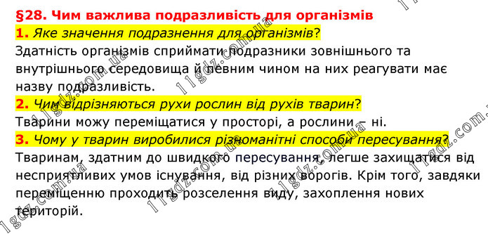 §28. Чим важлива подразливість для організмів 1. Яке значення подразнення для організмів? Здатність організмів сприймати подразники зовнішнього та внутрішнього середовища й певним чином на них реагувати має назву подразливість. 2. Чим відрізняються рухи рослин від рухів тварин? Тварини можу переміщатися у просторі, а рослини – ні. 3. Чому у тварин виробилися різноманітні способи пересування? Тваринам, здатним до швидкого пересування, легше захищатися від несприятливих умов існування, від різних ворогів. Крім того, завдяки переміщенню проходить розселення виду, захоплення нових територій.