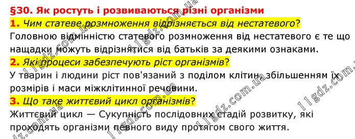 §30. Як ростуть і розвиваються різні організми 1. Чим статеве розмноження відрізняється від нестатевого? Головною відмінністю статевого розмноження від нестатевого є те що нащадки можуть відрізнятися від батьків за деякими ознаками. 2. Які процеси забезпечують ріст організмів? У тварин і людини ріст пов'язаний з поділом клітин, збільшенням їх розмірів і маси міжклітинної речовини. 3. Що таке життєвий цикл організмів? Життєвий цикл — Сукупність послідовних стадій розвитку, які проходять організми певного виду протягом свого життя.