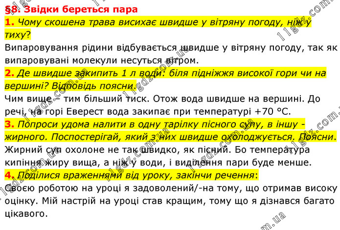 §8. Звідки береться пара 1. Чому скошена трава висихає швидше у вітряну погоду, ніж у тиху? Випаровування рідини відбувається швидше у вітряну погоду, так як випаровувані молекули несуться вітром. 2. Де швидше закипить 1 л води: біля підніжжя високої гори чи на вершині? Відповідь поясни. Чим вище – тим більший тиск. Отож вода швидше на вершині. До речі, на горі Еверест вода закипає при температурі +70 °С. 3. Попроси удома налити в одну тарілку пісного супу, в іншу - жирного. Поспостерігай, який з них швидше охолоджується. Поясни. Жирний суп охолоне не так швидко, як пісний. Бо температура кипіння жиру вища, а ніж у води, і виділення пари буде менше. 4. Поділися враженнями від уроку, закінчи речення: Своєю роботою на уроці я задоволений/-на тому, що отримав високу оцінку. Мій настрій на уроці став кращим, тому що я дізнався багато цікавого.