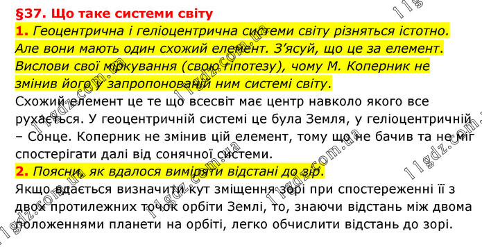 §37. Що таке системи світу 1. Геоцентрична і геліоцентрична системи світу різняться істотно. Але вони мають один схожий елемент. З’ясуй, що це за елемент. Вислови свої міркування (свою гіпотезу), чому М. Коперник не змінив його у запропонованій ним системі світу. Схожий елемент це те що всесвіт має центр навколо якого все рухається. У геоцентричній системі це була Земля, у геліоцентричній – Сонце. Коперник не змінив цій елемент, тому що не бачив та не міг спостерігати далі від сонячної системи. 2. Поясни, як вдалося виміряти відстані до зір. Якщо вдається визначити кут зміщення зорі при спостереженні її з двох протилежних точок орбіти Землі, то, знаючи відстань між двома положеннями планети на орбіті, легко обчислити відстань до зорі.