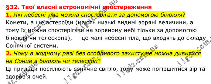 §32. Твої власні астрономічні спостереження 1. Які небесні тіла можна спостерігати за допомогою бінокля? Комети, а ще астероїди (мають низькі видимі зоряні величини, а тому їх можна спостерігати на зоряному небі тільки за допомогою бінокля чи телескопа), — це малі небесні тіла, що входять до складу Сонячної системи. 2. Чому в жодному разі без особливого захисту не можна дивитися на Сонце в бінокль чи телескоп? Ці прилади посилюють сонячне світло, тому може погіршитися зір та здоров’я очей.
