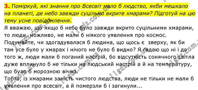 Поміркуй, які знання про Всесвіт мало б людство, якби мешкало на планеті, де небо завжди суцільно вкрите хмарами? Підготуй на цю тему усне повідомлення. Я вважаю, що якщо б небо було завжди вкрито суцільними хмарами, то люди, можливо, не мали б ніякого уявлення про космос. Подумайте, чи здогадувалася б людина, що щось є зверху, як би там усе було у хмарах і нічого не було б видно? Я гадаю що ні і до того ж, люди мали б поганий настрій, бо відсутність сонячного світла дуже вплинуло б не тільки на людський настрій а й на температуру, що було б морозною вічно. Тобто, із хмарами замість чистого людства, люди не тільки не мали б уявлення про всесвіт, а й померзли б і загинули...