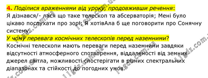 Поділися враженнями від уроку, продовживши речення: Я дізнався/- лася що таке телескоп та абсерваторія; Мені було цікаво послухати про зорі; Я хотівАла б ще поговорити про Сонячну систему. У чому перевага космічних телескопів перед наземними? Космічні телескопи мають переваги перед наземними завдяки відсутності атмосферного спотворення, віддаленості від земних джерел світла, можливості спостерігати в різних спектральних діапазонах та стійкості до погодних умов.