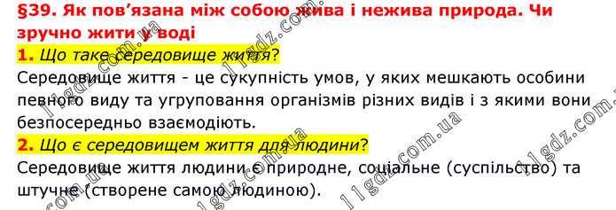 §39. Як пов’язана між собою жива і нежива природа. Чи зручно жити у воді 1. Що таке середовище життя? Середовище життя - це сукупність умов, у яких мешкають особини певного виду та угруповання організмів різних видів і з якими вони безпосередньо взаємодіють. 2. Що є середовищем життя для людини? Середовище життя людини є природне, соціальне (суспільство) та штучне (створене самою людиною).