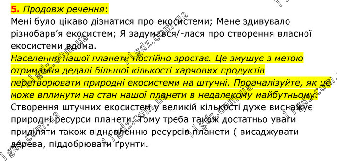 5. Продовж речення: Мені було цікаво дізнатися про екосистеми; Мене здивувало різнобарв’я екосистем; Я задумався/-лася про створення власної екосистеми вдома. Населення нашої планети постійно зростає. Це змушує з метою отримання дедалі більшої кількості харчових продуктів перетворювати природні екосистеми на штучні. Проаналізуйте, як це може вплинути на стан нашої планети в недалекому майбутньому. Створення штучних екосистем у великій кількості дуже виснажує природні ресурси планети. Тому треба також достатньо уваги приділяти також відновленню ресурсів планети ( висаджувати дерева, піддобрювати ґрунти.