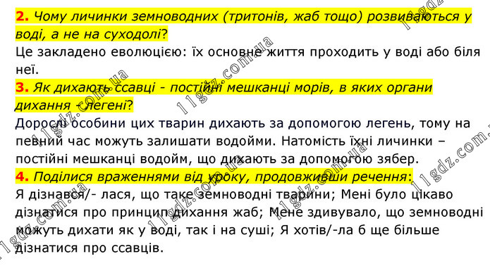 2. Чому личинки земноводних (тритонів, жаб тощо) розвиваються у воді, а не на суходолі? Це закладено еволюцією: їх основне життя проходить у воді або біля неї. 3. Як дихають ссавці - постійні мешканці морів, в яких органи дихання - легені? Дорослі особини цих тварин дихають за допомогою легень, тому на певний час можуть залишати водойми. Натомість їхні личинки – постійні мешканці водойм, що дихають за допомогою зябер. 4. Поділися враженнями від уроку, продовживши речення: Я дізнався/- лася, що таке земноводні тварини; Мені було цікаво дізнатися про принцип дихання жаб; Мене здивувало, що земноводні можуть дихати як у воді, так і на суші; Я хотів/-ла б ще більше дізнатися про ссавців.