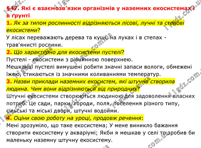 §47. Які є взаємозв’язки організмів у наземних екосистемах і в ґрунті 1. Як за типом рослинності відрізняються лісові, лучні та степові екосистеми? У лісах переважають дерева та кущі, на луках і в степах - трав'янисті рослини. 2. Що характерно для екосистеми пустелі? Пустелі - екосистеми з рівнинною поверхнею. Мешканці пустелі вимушені робити значні запаси вологи, обмежені їжею, стикаються із значними коливаннями температур. 3. Назви приклади наземних екосистем, які штучно створила людина. Чим вони відрізняються від природних? Штучні екосистеми створюються людиною для задоволення власних потреб. Це сади, парки, городи, поля, поселення різного типу, сільські та міські двори, штучні водойми. 4. Оціни свою роботу на уроці, продовж речення: Мені зрозуміло, що таке екосистема; У мене виникло бажання створити екосистему у акваріумі; Якби я мешкав у селі то зробив би маленьку наземну штучну екосистему.