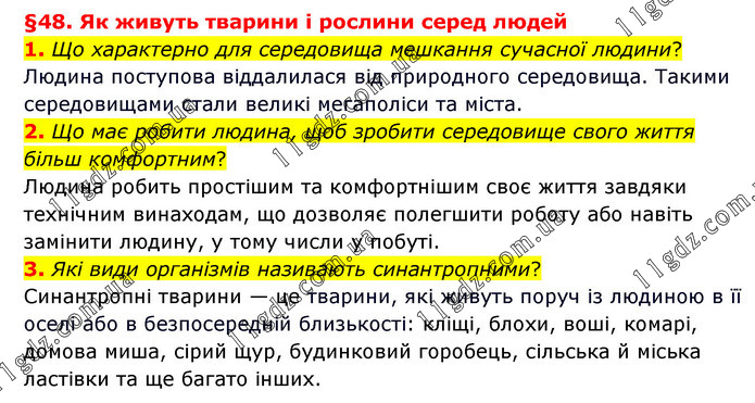 §48. Як живуть тварини і рослини серед людей 1. Що характерно для середовища мешкання сучасної людини? Людина поступова віддалилася від природного середовища. Такими середовищами стали великі мегаполіси та міста. 2. Що має робити людина, щоб зробити середовище свого життя більш комфортним? Людина робить простішим та комфортнішим своє життя завдяки технічним винаходам, що дозволяє полегшити роботу або навіть замінити людину, у тому числи у побуті. 3. Які види організмів називають синантропними? Синантропні тварини — це тварини, які живуть поруч із людиною в її оселі або в безпосередній близькості: кліщі, блохи, воші, комарі, домова миша, сірий щур, будинковий горобець, сільська й міська ластівки та ще багато інших.