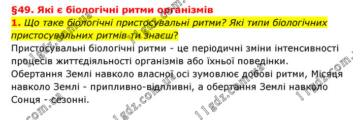 §49. Які є біологічні ритми організмів 1. Що таке біологічні пристосувальні ритми? Які типи біологічних пристосувальних ритмів ти знаєш? Пристосувальні біологічні ритми - це періодичні зміни інтенсивності процесів життєдіяльності організмів або їхньої поведінки. Обертання Землі навколо власної осі зумовлює добові ритми, Місяця навколо Землі - припливно-відпливні, а обертання Землі навколо Сонця - сезонні.