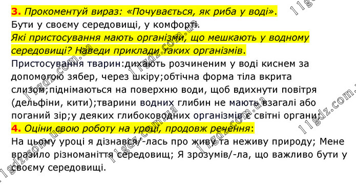 3. Прокоментуй вираз: «Почувається, як риба у воді». Бути у своєму середовищі, у комфорті. Які пристосування мають організми, що мешкають у водному середовищі? Наведи приклади таких організмів. Пристосування тварин:дихають розчиненим у воді киснем за допомогою зябер, через шкіру;обтічна форма тіла вкрита слизом;піднімаються на поверхню води, щоб вдихнути повітря (дельфіни, кити);тварини водних глибин не мають взагалі або поганий зір;у деяких глибоководних організмів є світні органи; 4. Оціни свою роботу на уроці, продовж речення: На цьому уроці я дізнався/-лась про живу та неживу природу; Мене вразило різноманіття середовищ; Я зрозумів/-ла, що важливо бути у своєму середовищі.