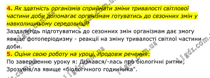 4. Як здатність організмів сприймати зміни тривалості світлової частини доби допомагає організмам готуватись до сезонних змін у навколишньому середовищі? Заздалегідь підготуватись до сезонних змін організмам дає змогу явище фотоперіодизму - реакції на зміну тривалості світлої частини доби. 5. Оціни свою роботу на уроці, продовж речення: По завершенню уроку я: Дізнався/-лась про біологічні ритми; Зрозумів/ла явище «біологічного годинника".