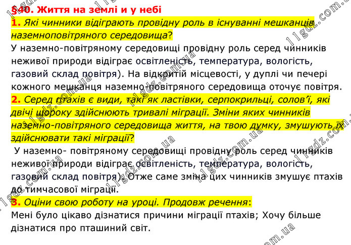 §40. Життя на землі и у небі 1. Які чинники відіграють провідну роль в існуванні мешканців наземноповітряного середовища? У наземно-повітряному середовищі провідну роль серед чинників неживої природи відіграє освітленість, температура, вологість, газовий склад повітря). На відкритій місцевості, у дуплі чи печері кожного мешканця наземно-повітряного середовища оточує повітря. 2. Серед птахів є види, такі як ластівки, серпокрильці, солов’ї, які двічі щороку здійснюють тривалі міграції. Зміни яких чинників наземно-повітряного середовища життя, на твою думку, змушують їх здійснювати такі міграції? У наземно- повітряному середовищі провідну роль серед чинників неживої природи відіграє освітленість, температура, вологість, газовий склад повітря). Отже саме зміна цих чинників змушує птахів до тимчасової міграції. 3. Оціни свою роботу на уроці. Продовж речення: Мені було цікаво дізнатися причини міграції птахів; Хочу більше дізнатися про пташиний світ.