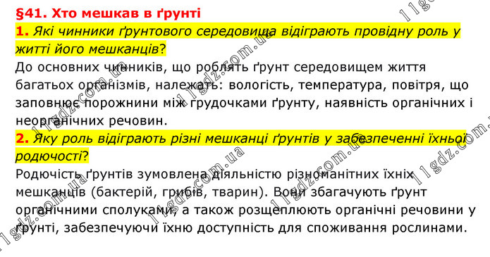 §41. Хто мешкав в ґрунті 1. Які чинники ґрунтового середовища відіграють провідну роль у житті його мешканців? До основних чинників, що роблять ґрунт середовищем життя багатьох організмів, належать: вологість, температура, повітря, що заповнює порожнини між грудочками ґрунту, наявність органічних і неорганічних речовин. 2. Яку роль відіграють різні мешканці ґрунтів у забезпеченні їхньої родючості? Родючість ґрунтів зумовлена діяльністю різноманітних їхніх мешканців (бактерій, грибів, тварин). Вони збагачують ґрунт органічними сполуками, а також розщеплюють органічні речовини у ґрунті, забезпечуючи їхню доступність для споживання рослинами.