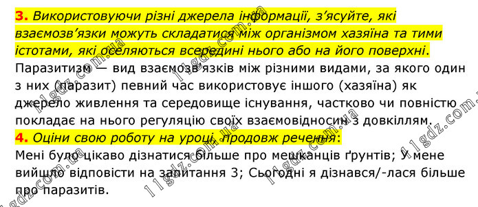 3. Використовуючи різні джерела інформації, з’ясуйте, які взаємозв’язки можуть складатися між організмом хазяїна та тими істотами, які оселяються всередині нього або на його поверхні. Паразитизм — вид взаємозв'язків між різними видами, за якого один з них (паразит) певний час використовує іншого (хазяїна) як джерело живлення та середовище існування, частково чи повністю покладає на нього регуляцію своїх взаємовідносин з довкіллям. 4. Оціни свою роботу на уроці, продовж речення: Мені було цікаво дізнатися більше про мешканців ґрунтів; У мене вийшло відповісти на запитання 3; Сьогодні я дізнався/-лася більше про паразитів.