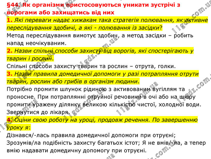 §44. Як організми пристосовуються уникати зустрічі з ворогами або захищатись від них 1. Які переваги надає хижакам така стратегія полювання, як активне переслідування здобичі, а які - полювання із засідки? Метод переслідування вимотує здобич, а метод засідки – робить напад неочікуваним. 2. Назви спільні способи захисту від ворогів, які спостерігають у тварин і рослин. Спільні способи захисту тварин та рослин – отрута, голки. 3. Назви правила домедичної допомоги у разі потрапляння отрути тварин, рослин або грибів в організм людини. Потрібно промити шлунок рідиною з активованим вугіллям та проносне. При потраплянні отруйної речовини в очі або на шкіру промити уражену ділянку великою кількістю чистої, холодної води. Звернутися до лікаря. 4. Оціни свою роботу на уроці, продовж речення. По завершенню уроку я: Дізнався/-лась правила домедичної допомоги при отруєні; Зрозумів/ла подібність захисту багатьох істот; Я не вмів/-ла, а тепер вмію надавати домедичну допомогу при отруєні.