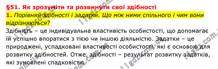 §51. Як зрозуміти та розвинути свої здібності 1. Порівняй здібності і задатки. Що між ними спільного і чим вони відрізняються? Здібність – це індивідуальна властивість особистості, що допомагає їй успішно впоратися з тією чи іншою діяльністю. Задатки – це природжені, успадковані властивості особистості, які є основою для розвитку здібностей. Отже, здібності – результат розвитку задатків, які зумовлені спадковістю.