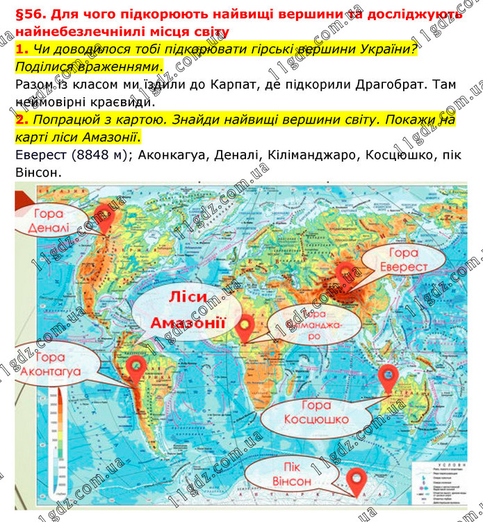 §56. Для чого підкорюють найвищі вершини та досліджують найнебезлечніилі місця світу 1. Чи доводилося тобі підкорювати гірські вершини України? Поділися враженнями. Разом із класом ми їздили до Карпат, де підкорили Драгобрат. Там неймовірні краєвиди. 2. Попрацюй з картою. Знайди найвищі вершини світу. Покажи на карті ліси Амазонії. Еверест (8848 м); Аконкагуа, Деналі, Кіліманджаро, Косцюшко, пік Вінсон.