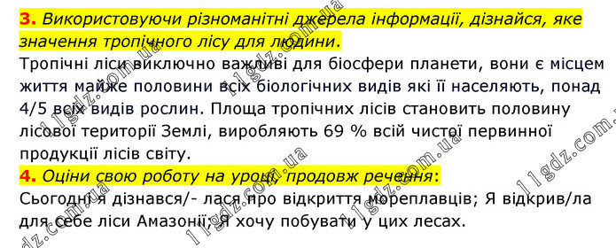 3. Використовуючи різноманітні джерела інформації, дізнайся, яке значення тропічного лісу для людини. Тропічні ліси виключно важливі для біосфери планети, вони є місцем життя майже половини всіх біологічних видів які її населяють, понад 4/5 всіх видів рослин. Площа тропічних лісів становить половину лісової території Землі, виробляють 69 % всій чистої первинної продукції лісів світу. 4. Оціни свою роботу на уроці, продовж речення: Сьогодні я дізнався/- лася про відкриття мореплавців; Я відкрив/ла для себе ліси Амазонії; Я хочу побувати у цих лесах.