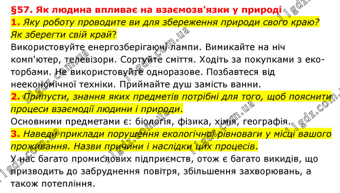 §57. Як людина впливає на взаємозв'язки у природі 1. Яку роботу проводите ви для збереження природи свого краю? Як зберегти свій край? Використовуйте енергозберігаючі лампи. Вимикайте на ніч комп'ютер, телевізори. Сортуйте сміття. Ходіть за покупками з еко-торбами. Не використовуйте одноразове. Позбавтеся від неекономічної техніки. Приймайте душ замість ванни. 2. Припусти, знання яких предметів потрібні для того, щоб пояснити процеси взаємодії людини і природи. Основними предметами є: біологія, фізика, хімія, географія. 3. Наведи приклади порушення екологічної рівноваги у місці вашого проживання. Назви причини і наслідки цих процесів. У нас багато промислових підприємств, отож є багато викидів, що призводить до забруднення повітря, збільшення захворювань, а також потепління.