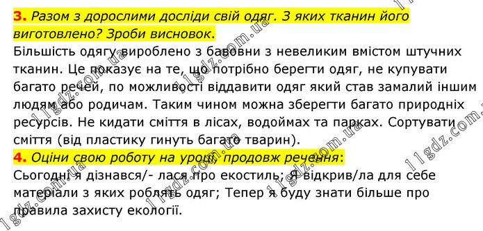 3. Разом з дорослими досліди свій одяг. З яких тканин його виготовлено? Зроби висновок. Більшість одягу вироблено з бавовни з невеликим вмістом штучних тканин. Це показує на те, що потрібно берегти одяг, не купувати багато речей, по можливості віддавити одяг який став замалий іншим людям або родичам. Таким чином можна зберегти багато природніх ресурсів. Не кидати сміття в лісах, водоймах та парках. Сортувати сміття (від пластику гинуть багато тварин). 4. Оціни свою роботу на уроці, продовж речення: Сьогодні я дізнався/- лася про екостиль; Я відкрив/ла для себе матеріали з яких роблять одяг; Тепер я буду знати більше про правила захисту екології.