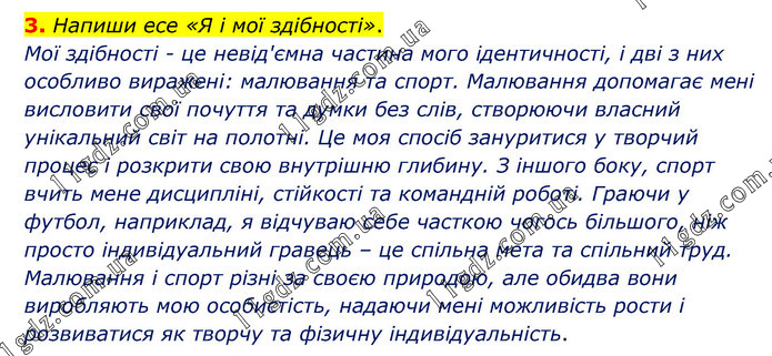 Напиши есе «Я і мої здібності». Мої здібності - це невід'ємна частина мого ідентичності, і дві з них особливо виражені: малювання та спорт. Малювання допомагає мені висловити свої почуття та думки без слів, створюючи власний унікальний світ на полотні. Це моя спосіб зануритися у творчий процес і розкрити свою внутрішню глибину. З іншого боку, спорт вчить мене дисципліні, стійкості та командній роботі. Граючи у футбол, наприклад, я відчуваю себе часткою чогось більшого, ніж просто індивідуальний гравець – це спільна мета та спільний труд. Малювання і спорт різні за своєю природою, але обидва вони виробляють мою особистість, надаючи мені можливість рости і розвиватися як творчу та фізичну індивідуальність.