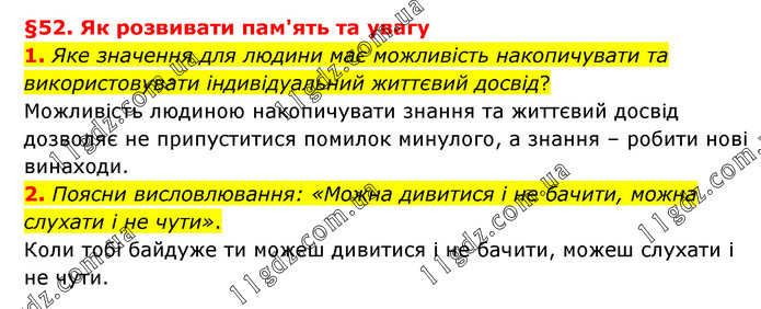 §52. Як розвивати пам'ять та увагу 1. Яке значення для людини має можливість накопичувати та використовувати індивідуальний життєвий досвід? Можливість людиною накопичувати знання та життєвий досвід дозволяє не припуститися помилок минулого, а знання – робити нові винаходи. 2. Поясни висловлювання: «Можна дивитися і не бачити, можна слухати і не чути». Коли тобі байдуже ти можеш дивитися і не бачити, можеш слухати і не чути.