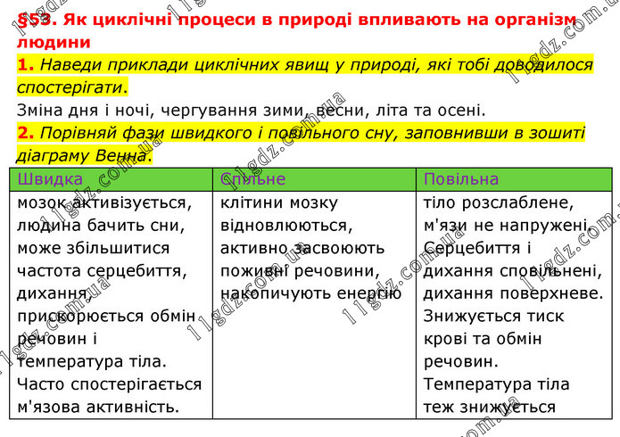 §53. Як циклічні процеси в природі впливають на організм людини 1. Наведи приклади циклічних явищ у природі, які тобі доводилося спостерігати. Зміна дня і ночі, чергування зими, весни, літа та осені. 2. Порівняй фази швидкого і повільного сну, заповнивши в зошиті діаграму Венна. Швидка Спільне Повільна мозок активізується, людина бачить сни, може збільшитися частота серцебиття, дихання, прискорюється обмін речовин і температура тіла. Часто спостерігається м'язова активність. клітини мозку відновлюються, активно засвоюють поживні речовини, накопичують енергію тіло розслаблене, м'язи не напружені. Серцебиття і дихання сповільнені, дихання поверхневе. Знижується тиск крові та обмін речовин. Температура тіла теж знижується
