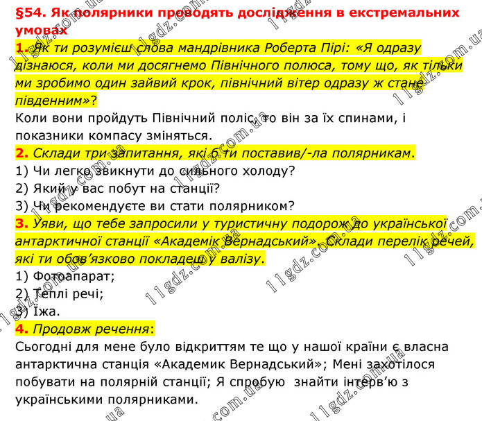 §54. Як полярники проводять дослідження в екстремальних умовах 1. Як ти розумієш слова мандрівника Роберта Пірі: «Я одразу дізнаюся, коли ми досягнемо Північного полюса, тому що, як тільки ми зробимо один зайвий крок, північний вітер одразу ж стане південним»? Коли вони пройдуть Північний поліс, то він за їх спинами, і показники компасу зміняться. 2. Склади три запитання, які б ти поставив/-ла полярникам. 1) Чи легко звикнути до сильного холоду? 2) Який у вас побут на станції? 3) Чи рекомендуєте ви стати полярником? 3. Уяви, що тебе запросили у туристичну подорож до української антарктичної станції «Академік Вернадський». Склади перелік речей, які ти обов’язково покладеш у валізу. 1) Фотоапарат; 2) Теплі речі; 3) Їжа. 4. Продовж речення: Сьогодні для мене було відкриттям те що у нашої країни є власна антарктична станція «Академик Вернадський»; Мені захотілося побувати на полярній станції; Я спробую знайти інтерв’ю з українськими полярниками.