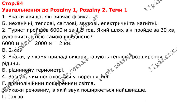 Узагальнення до Розділу 1, Розділу 2. Теми 1 1. Укажи явища, які вивчає фізика. Б. механічні, теплові, світлові, звукові, електричні та магнітні. 2. Турист пройшов 6000 м за 1,5 год. Який шлях він пройде за 30 хв, рухаючись з тією самою швидкістю? 6000 м : 3 = 2000 м = 2 км. В. 2 км. 3. Укажи, у якому приладі використовують теплове розширення рідини. Б. рідинному термометрі. 4. Зазнач, чим пояснюється утворення тіні. Г. прямолінійним поширенням світла. 5. Укажи речовину, в якій звук поширюється найшвидше. Г. залізо.