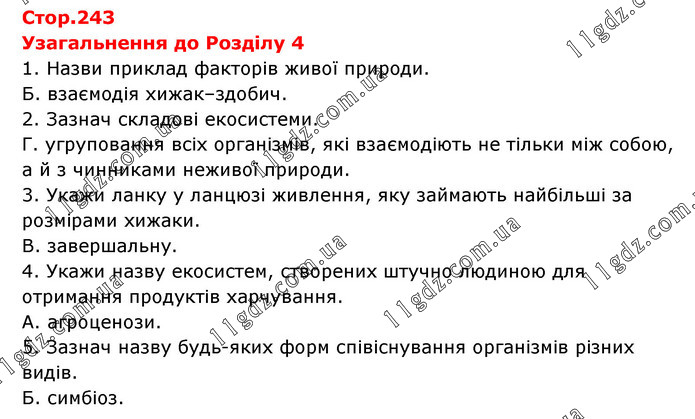 Узагальнення до Розділу 4 1. Назви приклад факторів живої природи. Б. взаємодія хижак–здобич. 2. Зазнач складові екосистеми. Г. угруповання всіх організмів, які взаємодіють не тільки між собою, а й з чинниками неживої природи. 3. Укажи ланку у ланцюзі живлення, яку займають найбільші за розмірами хижаки. В. завершальну. 4. Укажи назву екосистем, створених штучно людиною для отримання продуктів харчування. А. агроценози. 5. Зазнач назву будь-яких форм співіснування організмів різних видів. Б. симбіоз.