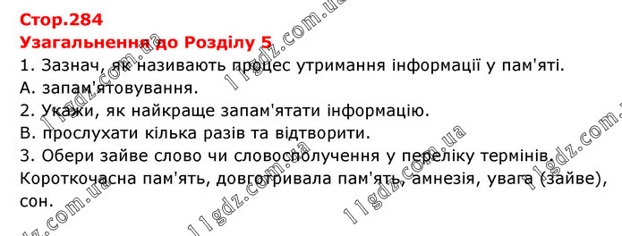 Узагальнення до Розділу 5 1. Зазнач, як називають процес утримання інформації у пам'яті. А. запам'ятовування. 2. Укажи, як найкраще запам'ятати інформацію. В. прослухати кілька разів та відтворити. 3. Обери зайве слово чи словосполучення у переліку термінів. Короткочасна пам'ять, довготривала пам'ять, амнезія, увага (зайве), сон.