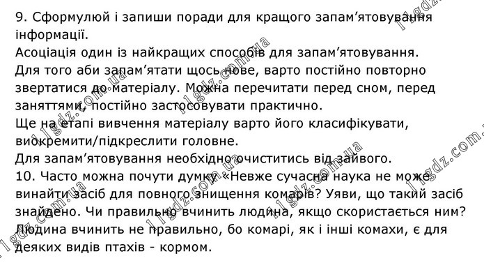 9. Сформулюй і запиши поради для кращого запам’ятовування інформації. Асоціація один із найкращих способів для запам’ятовування. Для того аби запам’ятати щось нове, варто постійно повторно звертатися до матеріалу. Можна перечитати перед сном, перед заняттями, постійно застосовувати практично. Ще на етапі вивчення матеріалу варто його класифікувати, виокремити/підкреслити головне. Для запам’ятовування необхідно очиститись від зайвого. 10. Часто можна почути думку «Невже сучасна наука не може винайти засіб для повного знищення комарів? Уяви, що такий засіб знайдено. Чи правильно вчинить людина, якщо скористається ним? Людина вчинить не правильно, бо комарі, як і інші комахи, є для деяких видів птахів - кормом.