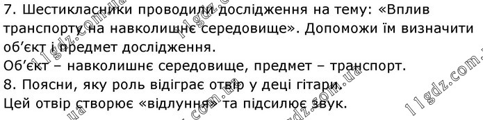 7. Шестикласники проводили дослідження на тему: «Вплив транспорту на навколишнє середовище». Допоможи їм визначити об’єкт і предмет дослідження. Об’єкт – навколишнє середовище, предмет – транспорт. 8. Поясни, яку роль відіграє отвір у деці гітари. Цей отвір створює «відлуння» та підсилює звук.