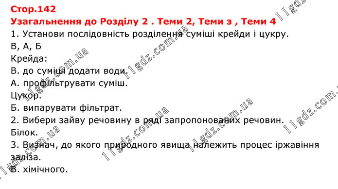 Узагальнення до Розділу 2 . Теми 2, Теми з , Теми 4 1. Установи послідовність розділення суміші крейди і цукру. В, А, Б Крейда: В. до суміші додати води. А. профільтрувати суміш. Цукор. Б. випарувати фільтрат. 2. Вибери зайву речовину в ряді запропонованих речовин. Білок. 3. Визнач, до якого природного явища належить процес іржавіння заліза. В. хімічного.