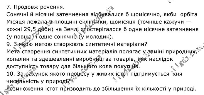 7. Продовж речення. Сонячні й місячні затемнення відбувалися б щомісячно, якби орбіта Місяця лежала в площині екліптики, щомісяця (точніше кажучи — кожні 29,5 доби) на Землі спостерігалося б одне місячне затемнення (у повню) і одне сонячне (у молодик). 9. З якою метою створюють синтетичні матеріали? Мета створення синтетичних матеріалів полягає у заміні природних копалин та здешевленні виробництва товарів, і як наслідок доступність товару для більшого кола покупців. 10. За рахунок якого процесу у живих істот підтримується їхня чисельність у природі? Розмноження істот призводить до збільшення їх кількості у природі.