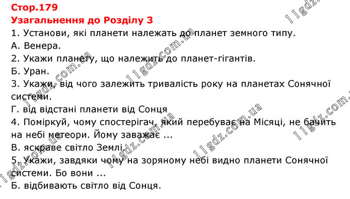 Узагальнення до Розділу 3 1. Установи, які планети належать до планет земного типу. А. Венера. 2. Укажи планету, що належить до планет-гігантів. Б. Уран. 3. Укажи, від чого залежить тривалість року на планетах Сонячної системи. Г. від відстані планети від Сонця 4. Поміркуй, чому спостерігач, який перебуває на Місяці, не бачить на небі метеори. Йому заважає ... В. яскраве світло Землі. 5. Укажи, завдяки чому на зоряному небі видно планети Сонячної системи. Бо вони ... Б. відбивають світло від Сонця.