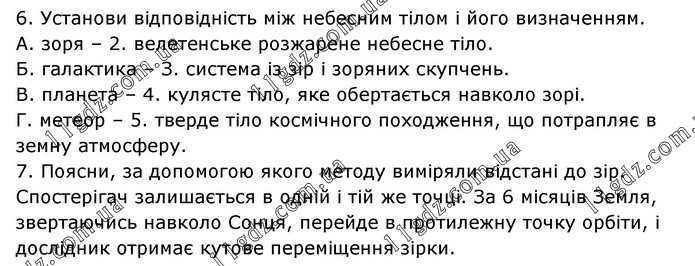 6. Установи відповідність між небесним тілом і його визначенням. А. зоря – 2. велетенське розжарене небесне тіло. Б. галактика – З. система із зір і зоряних скупчень. В. планета – 4. кулясте тіло, яке обертається навколо зорі. Г. метеор – 5. тверде тіло космічного походження, що потрапляє в земну атмосферу. 7. Поясни, за допомогою якого методу виміряли відстані до зір. Спостерігач залишається в одній і тій же точці. За 6 місяців Земля, звертаючись навколо Сонця, перейде в протилежну точку орбіти, і дослідник отримає кутове переміщення зірки.