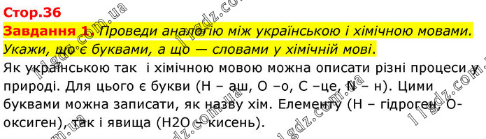 Завдання 1. Проведи аналогію між українською і хімічною мовами. Укажи, що є буквами, а що — словами у хімічній мові. Як українською так і хімічною мовою можна описати різні процеси у природі. Для цього є букви (Н – аш, О –о, С –це, N – н). Цими буквами можна записати, як назву хім. Елементу (Н – гідроген, О- оксиген), так і явища (Н2О – кисень).