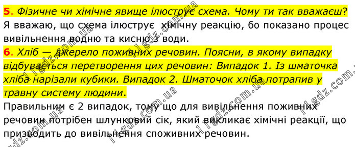 5. Фізичне чи хімічне явище ілюструє схема. Чому ти так вважаєш? Я вважаю, що схема ілюструє хімічну реакцію, бо показано процес вивільнення водню та кисню з води. 6. Хліб — джерело поживних речовин. Поясни, в якому випадку відбувається перетворення цих речовин: Випадок 1. Із шматочка хліба нарізали кубики. Випадок 2. Шматочок хліба потрапив у травну систему людини. Правильним є 2 випадок, тому що для вивільнення поживних речовин потрібен шлунковий сік, який викликає хімічні реакції, що призводить до вивільнення споживних речовин.
