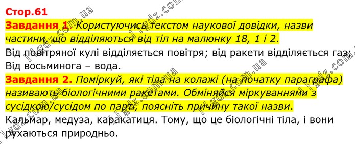 Стор.61 Завдання 1. Користуючись текстом наукової довідки, назви частини, що відділяються від тіл на малюнку 18, 1 і 2. Від повітряної кулі відділяється повітря; від ракети відділяється газ; Від восьминога – вода. Завдання 2. Поміркуй, які тіла на колажі (на початку параграфа) називають біологічними ракетами. Обміняйся міркуваннями з сусідкою/сусідом по парті, поясніть причину такої назви. Кальмар, медуза, каракатиця. Тому, що це біологічні тіла, і вони рухаються природньо.