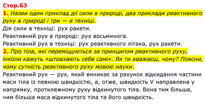 1. Назви один приклад дії сили в природі, два приклади реактивного руху в природі і три — в техніці. Дія сили в техніці: рух ракети. Реактивний рух в природі: рух восьминога. Реактивний рух в техніці: рух реактивного літака, рух ракети. 2. Про тіла, які переміщуються за принципом реактивного руху, інколи кажуть «штовхають себе самі». Як ти вважаєш, чому? Поясни, чому сутність реактивного руху мовою науки. Реактивний рух — рух, який виникає за рахунок відкидання частини маси тіла із певною швидкістю, а, отже, швидкість V направлена у напрямку, протилежному руху відкинутого тіла. Вона тим більша, чим більша маса відкинутого тіла та його швидкість.