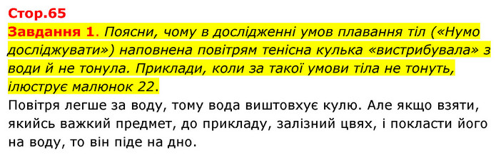 Завдання 1. Поясни, чому в дослідженні умов плавання тіл («Нумо досліджувати») наповнена повітрям тенісна кулька «вистрибувала» з води й не тонула. Приклади, коли за такої умови тіла не тонуть, ілюструє малюнок 22. Повітря легше за воду, тому вода виштовхує кулю. Але якщо взяти, якийсь важкий предмет, до прикладу, залізний цвях, і покласти його на воду, то він піде на дно.