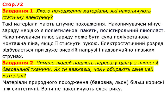 Завдання 1. Якого походження матеріали, які накопичують статичну електрику? Такі матеріали мають штучне походження. Накопичувачем мінус-заряду нерідко є поліетиленові пакети, полістирольний пінопласт. Накопичувачем плюс-заряду може бути суха поліуретанова монтажна піна, якщо її стиснути рукою. Електростатичний розряд відбувається при дуже високій напрузі і надзвичайно низьких струмах. Завдання 2. Чимало людей надають перевагу одягу з лляної й бавовняної тканини. Як ти вважаєш, чому обирають саме цей матеріал? Матеріали природного походження (бавовна, льон) більш корисні ніж синтетичні. Вони не накопичують електрику.