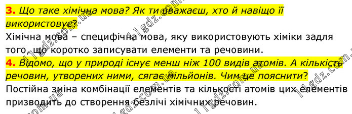 3. Що таке хімічна мова? Як ти вважаєш, хто й навіщо її використовує? Хімічна мова – специфічна мова, яку використовують хіміки задля того, що коротко записувати елементи та речовини. 4. Відомо, що у природі існує менш ніж 100 видів атомів. А кількість речовин, утворених ними, сягає мільйонів. Чим це пояснити? Постійна зміна комбінації елементів та кількості атомів цих елементів призводить до створення безлічі хімічних речовин.