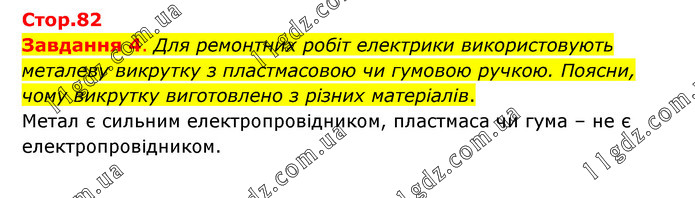 Завдання 4. Для ремонтних робіт електрики використовують металеву викрутку з пластмасовою чи гумовою ручкою. Поясни, чому викрутку виготовлено з різних матеріалів. Метал є сильним електропровідником, пластмаса чи гума – не є електропровідником.