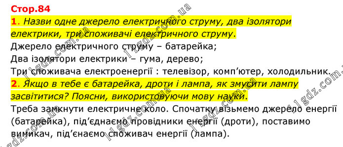 1. Назви одне джерело електричного струму, два ізолятори електрики, три споживачі електричного струму. Джерело електричного струму – батарейка; Два ізолятори електрики – гума, дерево; Три споживача електроенергії : телевізор, комп’ютер, холодильник. 2. Якщо в тебе є батарейка, дроти і лампа, як змусити лампу засвітитися? Поясни, використовуючи мову науки. Треба замкнути електричне коло. Спочатку візьмемо джерело енергії (батарейка), під’єднаємо провідники енергії (дроти), поставимо вимикач, під’єнаємо споживач енергії (лампа).