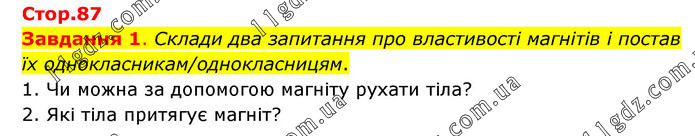 Завдання 1. Склади два запитання про властивості магнітів і постав їх однокласникам/однокласницям. 1. Чи можна за допомогою магніту рухати тіла? 2. Які тіла притягує магніт?