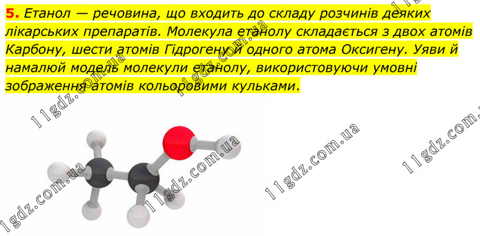Етанол — речовина, що входить до складу розчинів деяких лікарських препаратів. Молекула етанолу складається з двох атомів Карбону, шести атомів Гідрогену й одного атома Оксигену. Уяви й намалюй модель молекули етанолу, використовуючи умовні зображення атомів кольоровими кульками.
