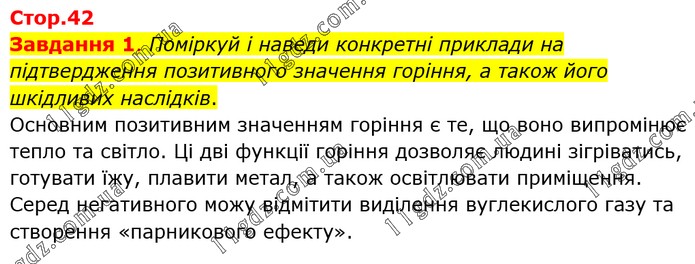 Завдання 1. Поміркуй і наведи конкретні приклади на підтвердження позитивного значення горіння, а також його шкідливих наслідків. Основним позитивним значенням горіння є те, що воно випромінює тепло та світло. Ці дві функції горіння дозволяє людині зігріватись, готувати їжу, плавити метал, а також освітлювати приміщення. Серед негативного можу відмітити виділення вуглекислого газу та створення «парникового ефекту».